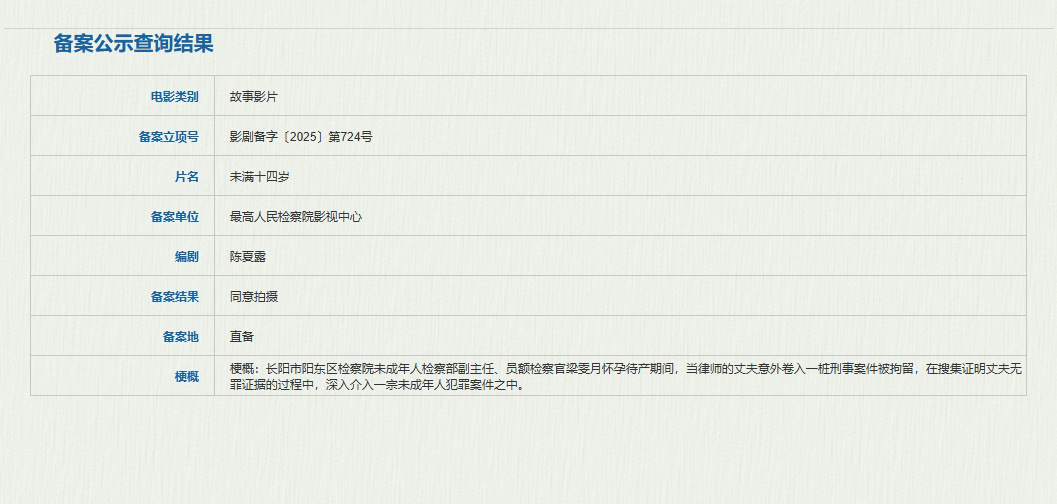 1905电影网讯 5月14日,据国家电影局最新备案、立项公示,电影《未满十四岁》立项,编剧为陈夏露,备案单位为最高人民检察院影视中心。影片聚焦未成年人犯罪,由陈夏露、万迪执导。